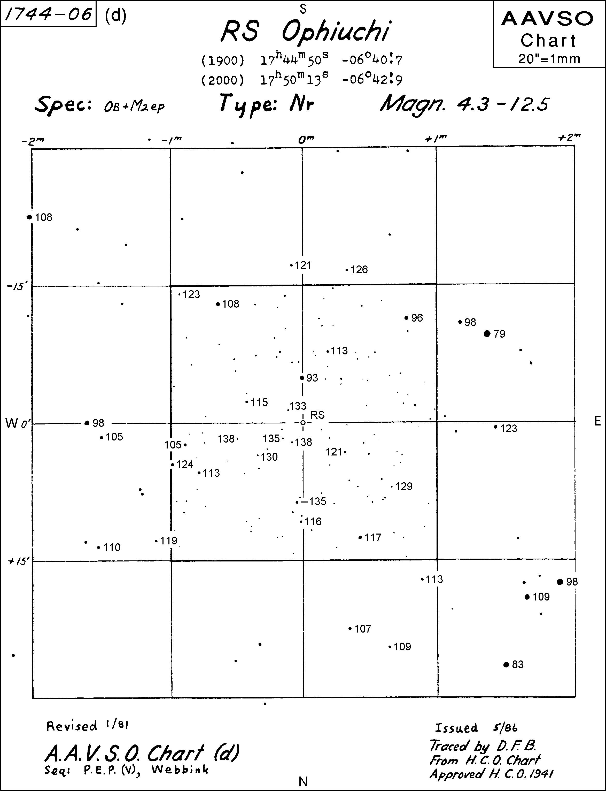 Weiter oben sind die genauen Beobachtungszeiten der Satelliten aufgeführt, auch außerhalb dieser Zeiten sind Beobachtungen erwünscht (Swift beobachtet bis in den Oktober hinein). RS Oph hatte zuletzt am 12. Februar 2006 einen hellen Ausbruch, erreicht 4.8 mag visuell und blieb dann fast 3 Monate heller als 10.5 mag. Zur Zeit befindet sich RS Oph bei etwas 11.8 - 12.0 mag. Beobachtungen werden erbeten an die AAVSO: http://www.aavso.org und auch gerne an die BAV: http://www.bav-astro.de Dietmar Bannuscher, 02.09.06 Aufsuchkarte