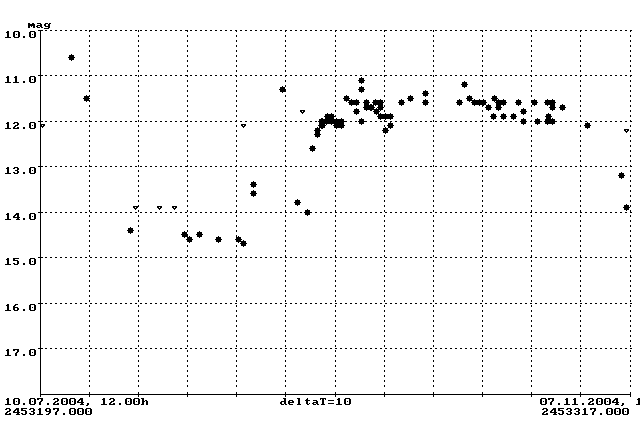 FG Sge beendete in diesem Sommer ein langwierige Phase verminderter Helligkeit und erreichte erstmals seit April 2001 wieder eine Helligkeit von 11 mag. Wie auch während der letzten hellen Phase sind bereits jetzt wieder quasi-periodische Schwankungen in einem Zeitraum von 100 Tagen erkennbar. So gab es nach dem Maximum Mitte Juli einen Einbruch auf 11.7 mag Ende September und anschließend einen erneuten Anstieg auf 10.8 mag bis Ende Oktober. Die Lichtkurve in Abbildung 6 stellt den bisherigen Verlauf der hellen Phase von FG Sge dar.