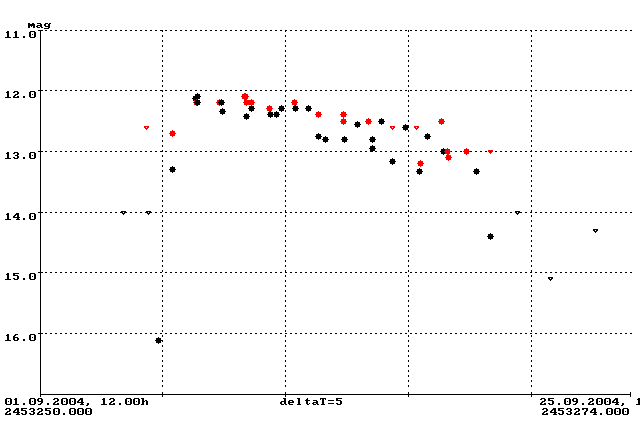 Nach einem kurzen Anstieg bis auf 11.2 mag fiel die Helligkeit auf 11.6 mag und blieb dort zwischen Mitte September und Ende Oktober. In der letzten Oktoberwoche zeigte sich ein langsamer Abstieg, der knapp unter 12 mag führte. In der ersten Woche des Monats November endete die konstante Phase und die Helligkeit fiel zurück auf das übliche Nivaeu des Minimums.